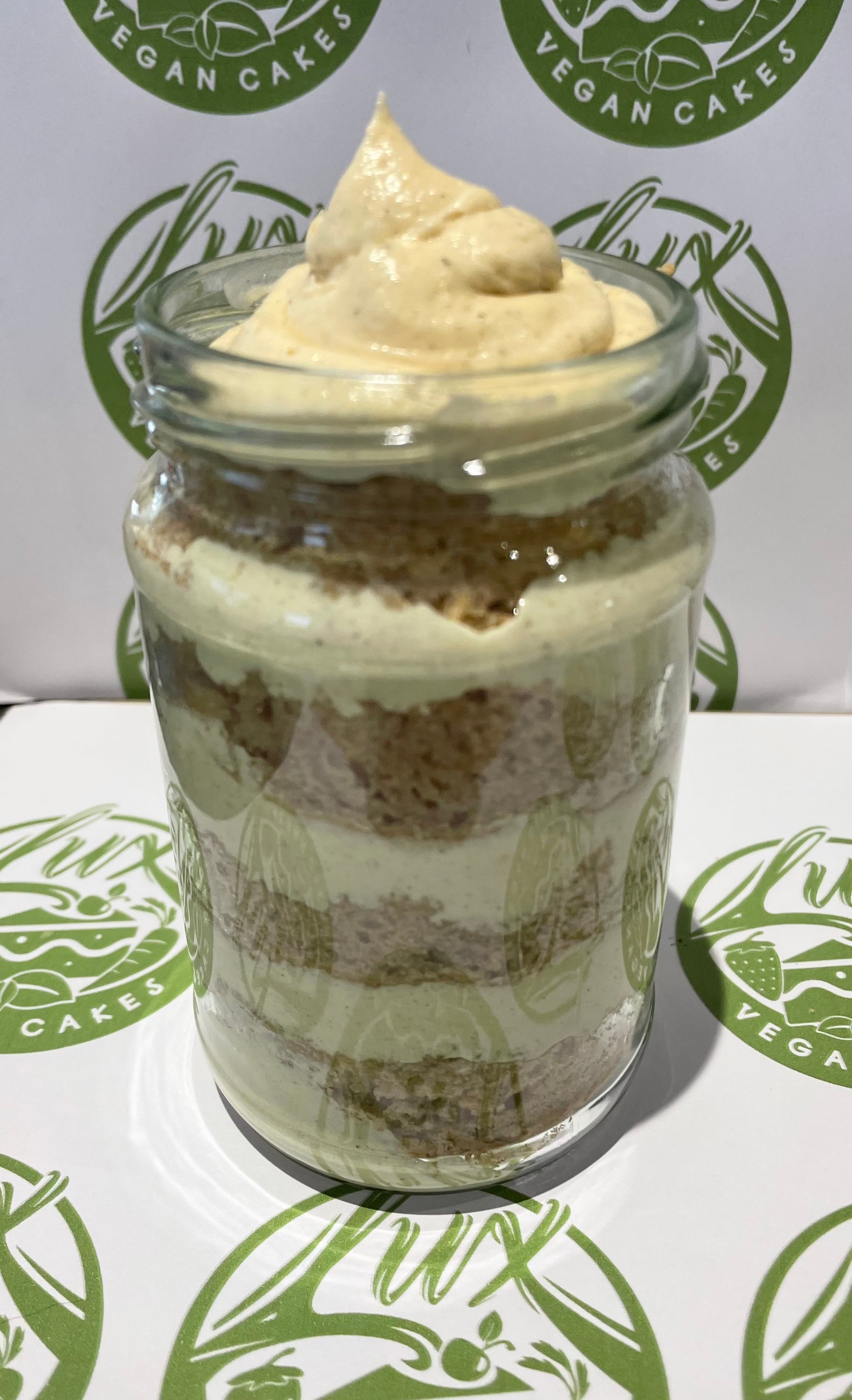 This is a pack of Vegan Chai flavoured cake in medium recyclable glass jars (300ml), I layer a vegan Chai latte flavoured sponge cake and creamy Chai buttercream