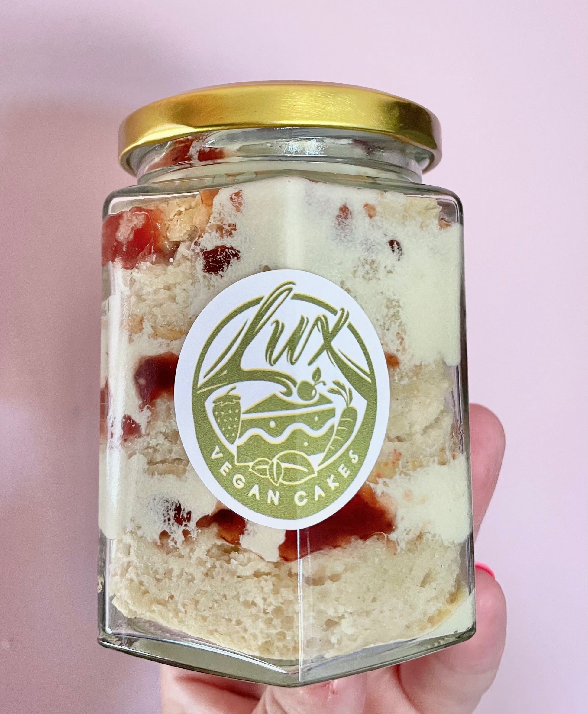 This is a pack of Vegan Victoria sponge flavoured cake in medium recyclable glass jars (300ml), I layer a vegan Vanilla sponge cake and strawberry jam and Creamy vanilla frosting together and a swirl of strawberry jam on top