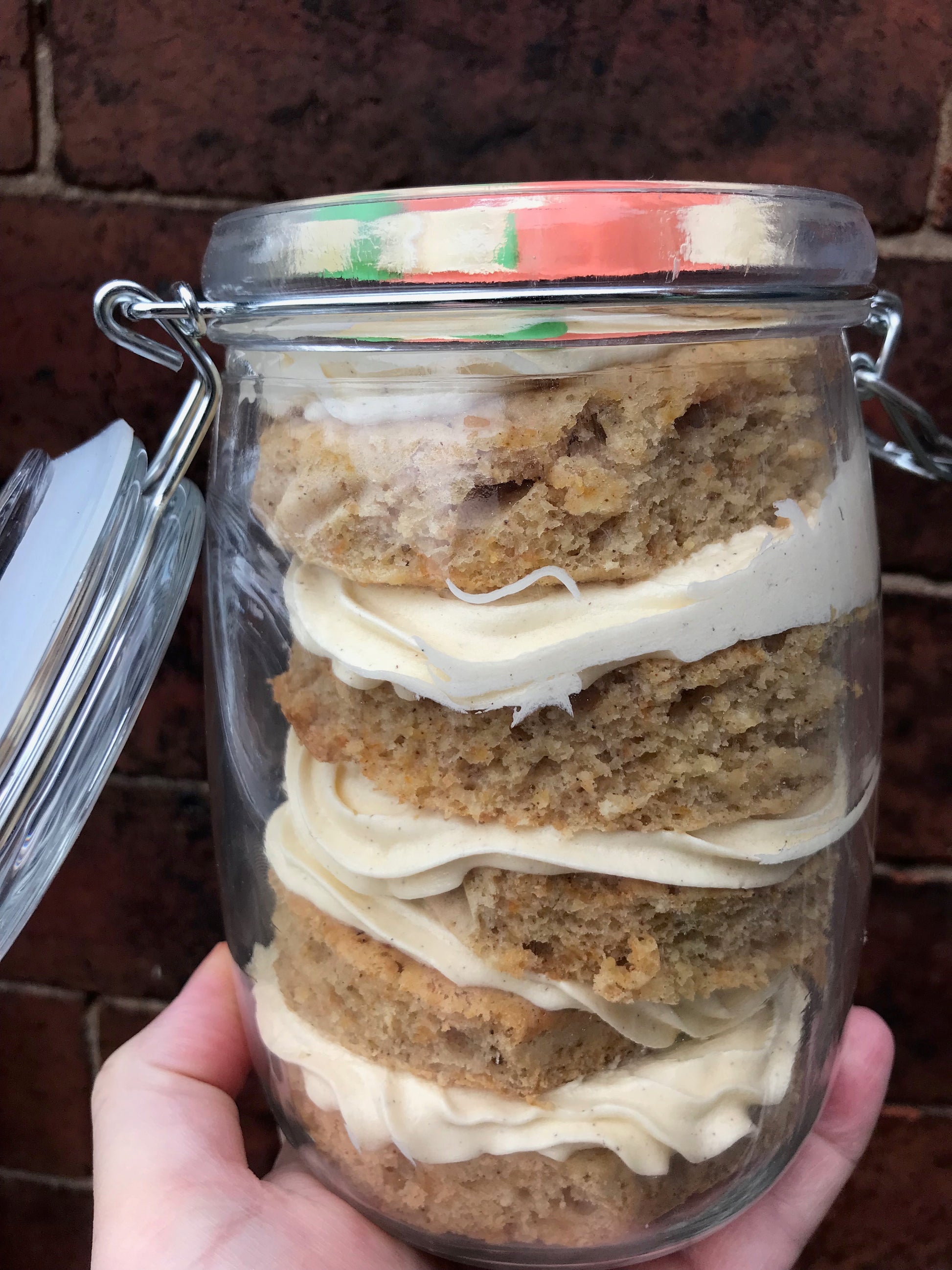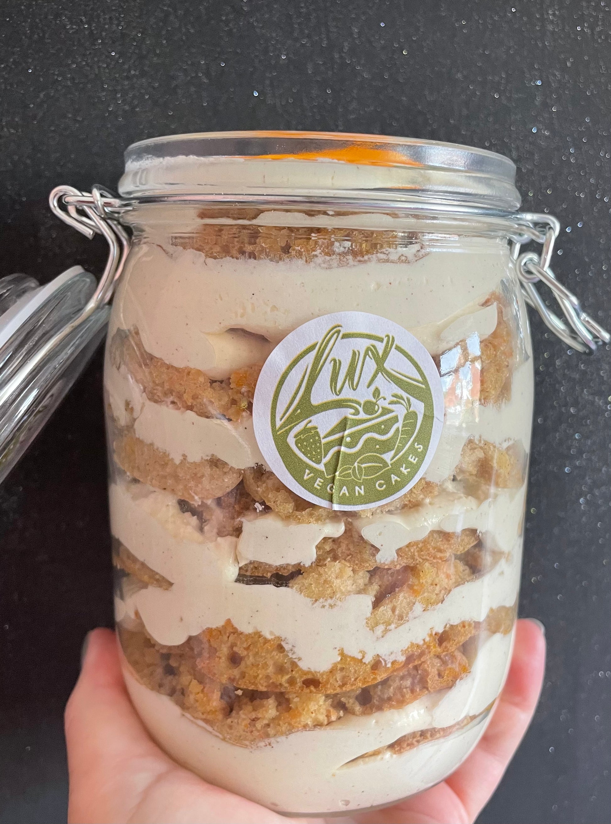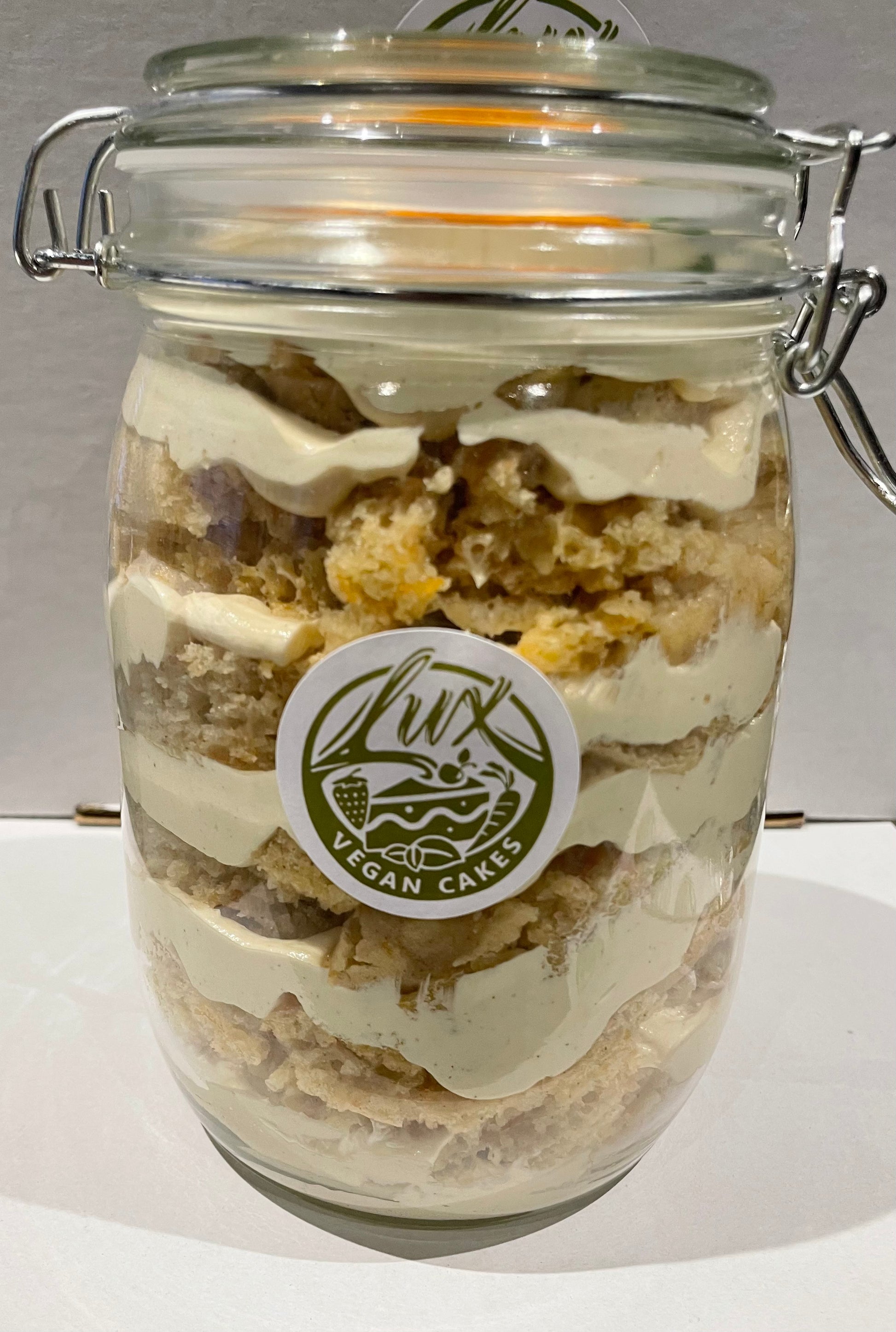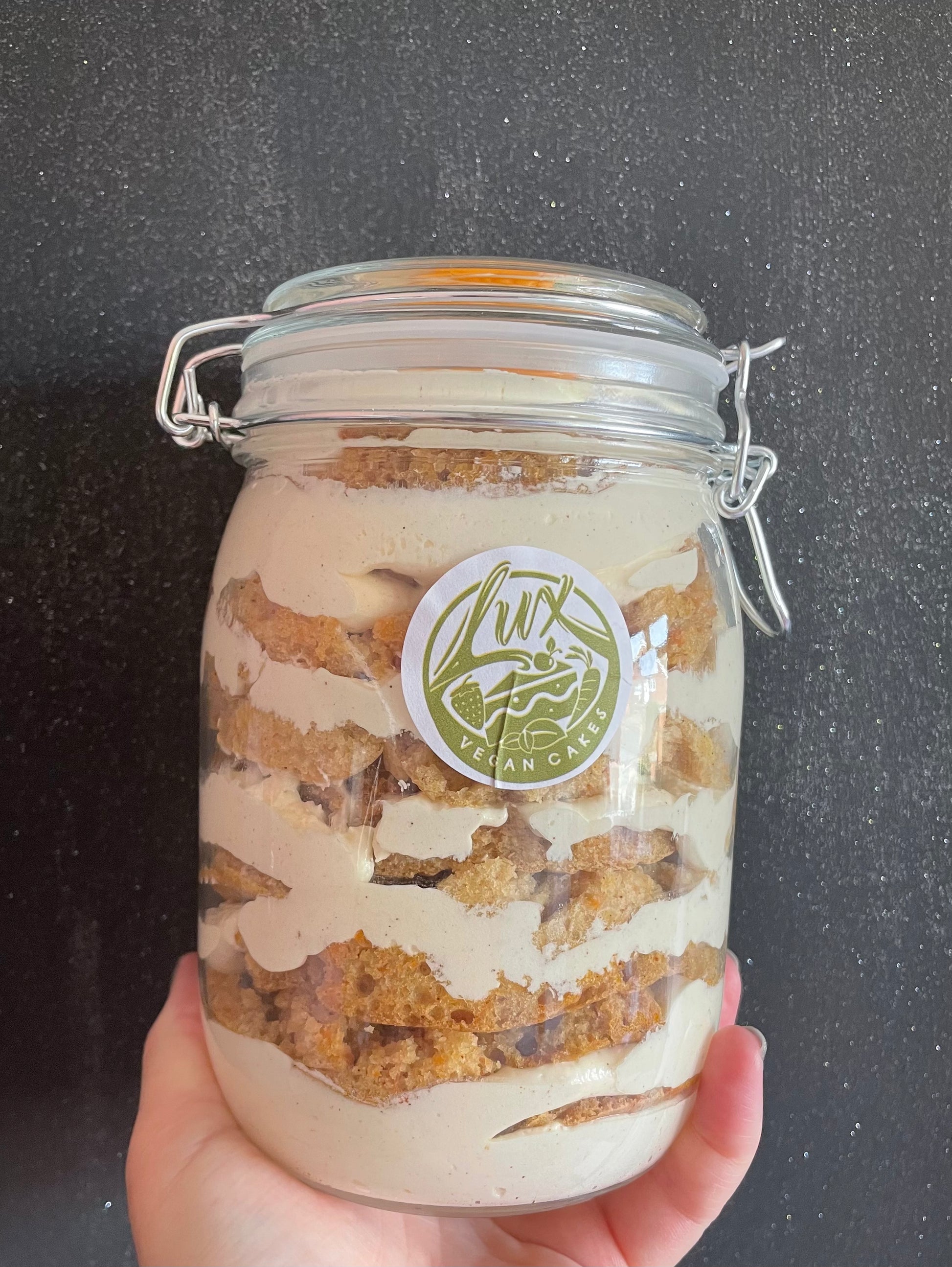 When a small jar isn’t enough for you, try this WHOLE Vegan carrot Cake in a 1 litre glass jar. I layer vegan carrot cake sponge and vegan vanilla frosting sprinkled with cinnamon and add fondant carrots on top as well. A great treat!