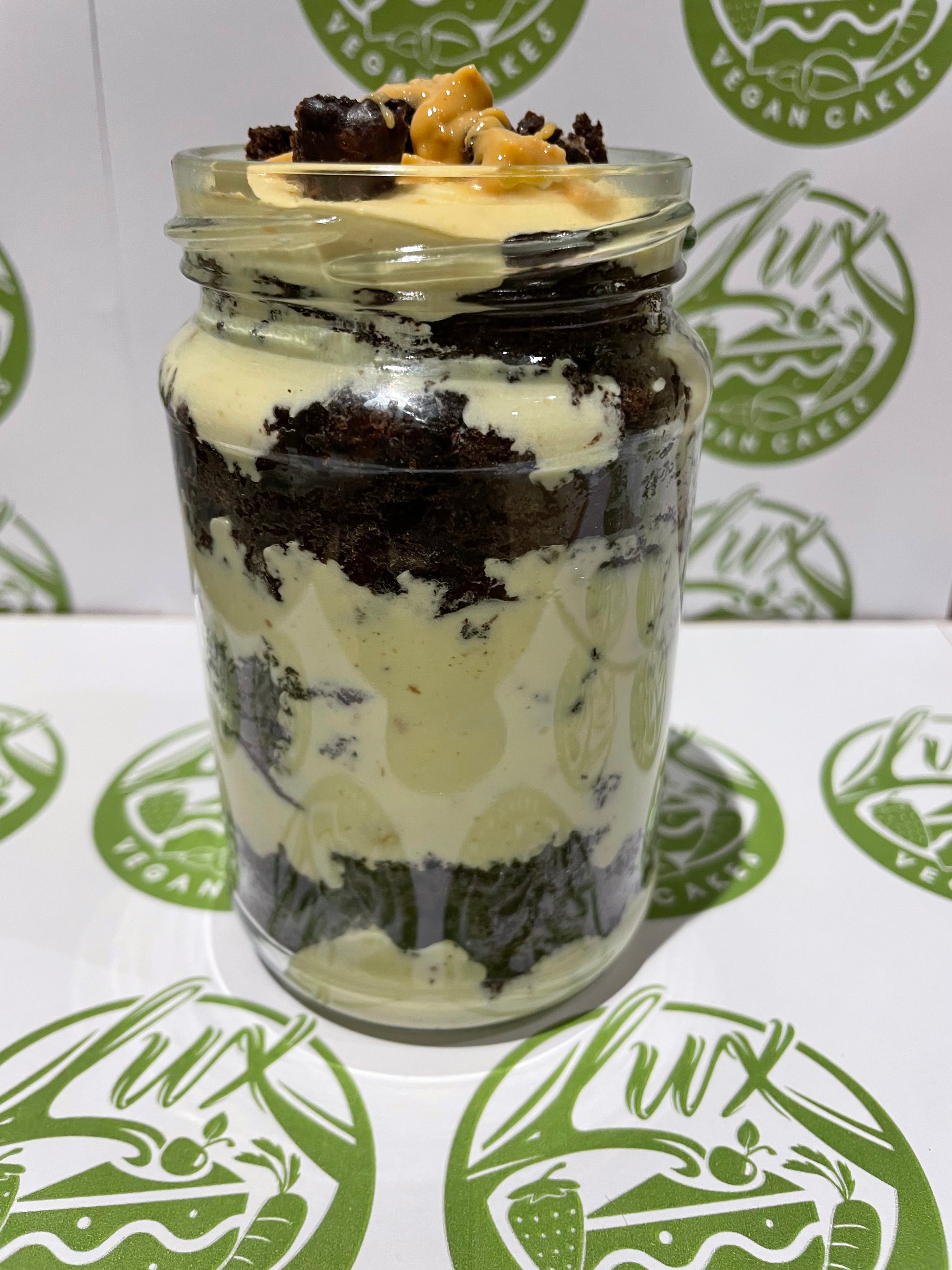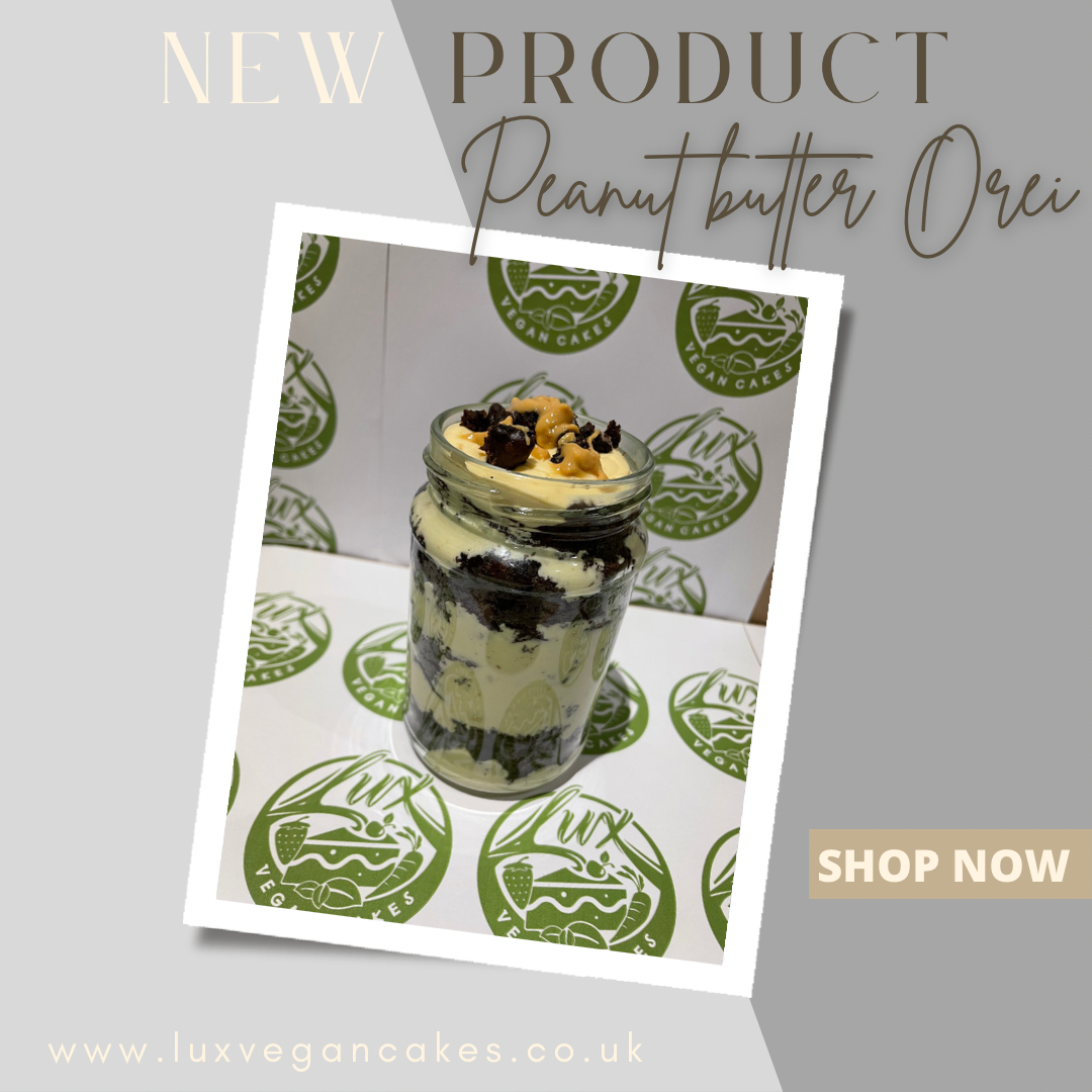 This is a pack of Vegan Peanut Butter Oreo cake in medium recyclable glass jars (300ml), I layer a vegan Peanut butter Oreo chocolate sponge cake and creamy peanut butter buttercream topped with oreo biscuits pieces and pb