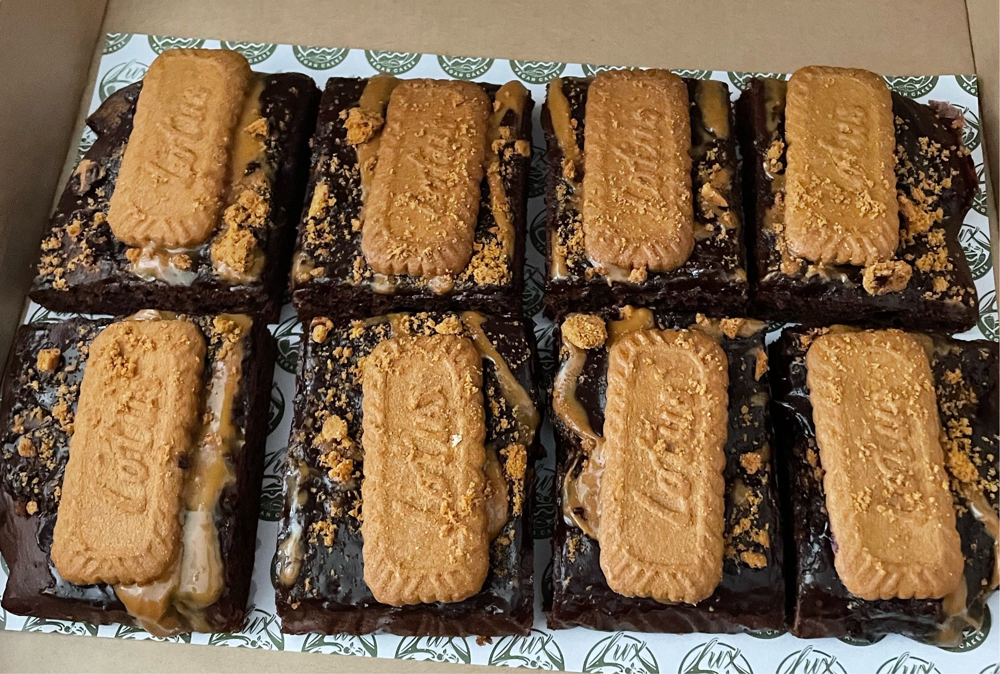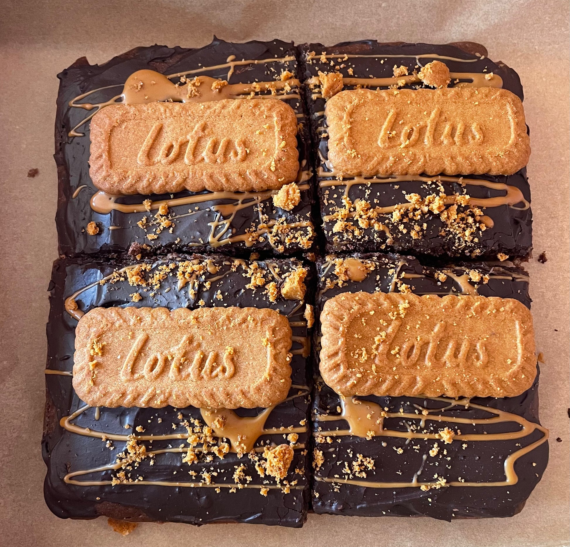 These delicious vegan chocolate and Biscoff brownie cakes are a delicious soft sponge topped with vegan chocolate icing and Biscoff drizzle and a whole Biscoff biscuit.