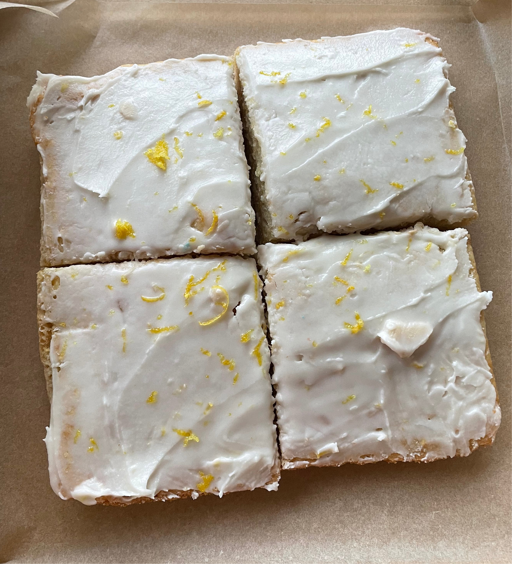 These light and lemony sponge blondie cakes are topped with lemon icing and lemon zest.