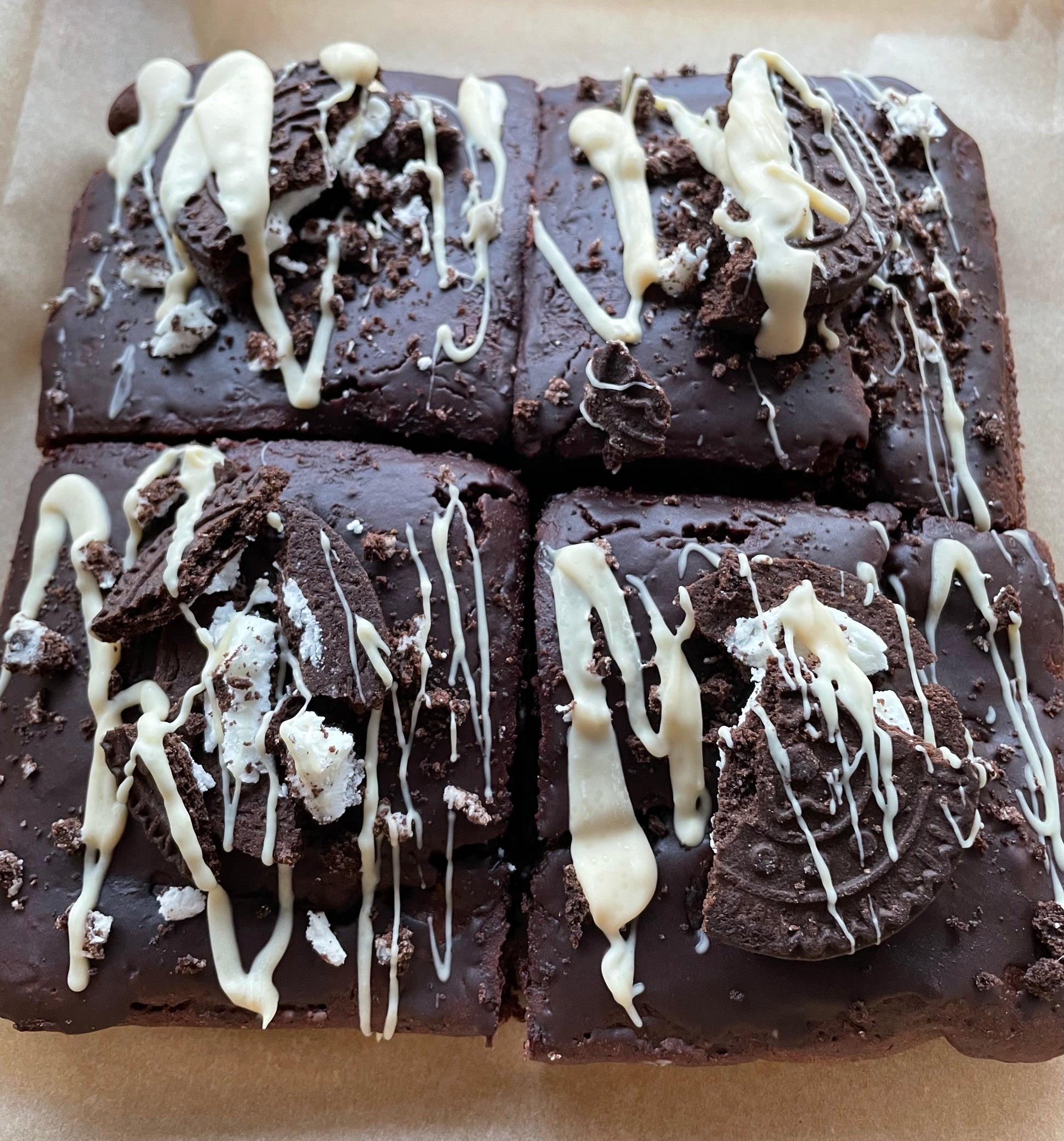 These are a delicious vegan chocolate sponge brownies combined with vegan Oreos inside and topped with vegan Oreo and drizzled with vegan white chocolate.