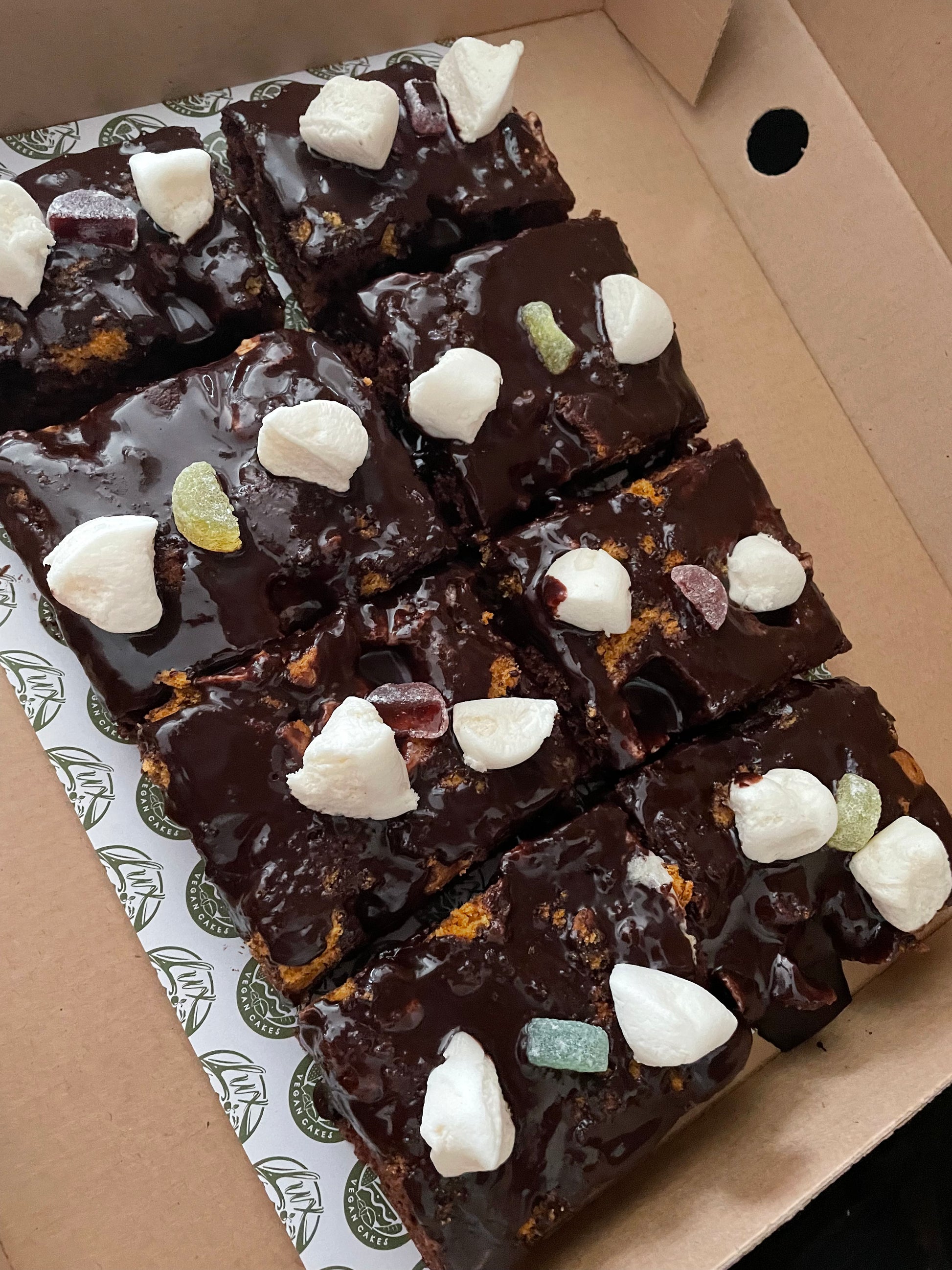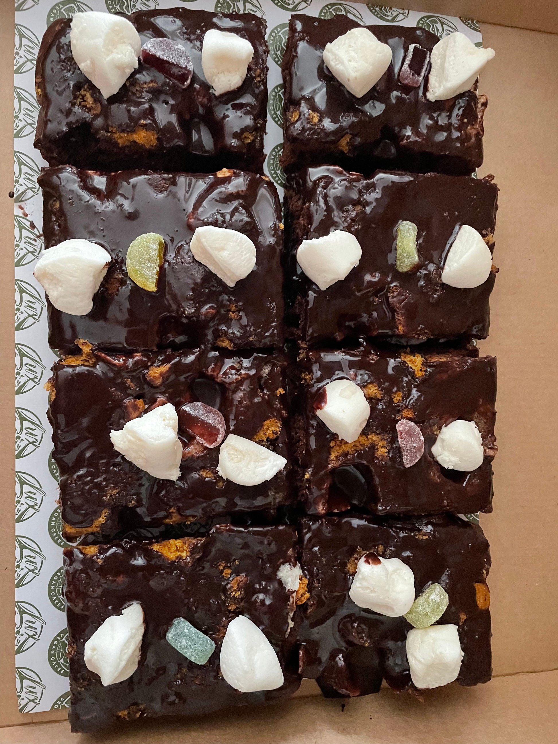 My unique to Lux vegan Rocky Road chocolate brownie cakes are made with vegan Marshmallows, vegan sweets and ginger and Biscoff biscuits topped mixed in the brownie with chocolate icing on top and a mix of vegan sweets and vegan marshmallows.(sweets may vary depending on availability)