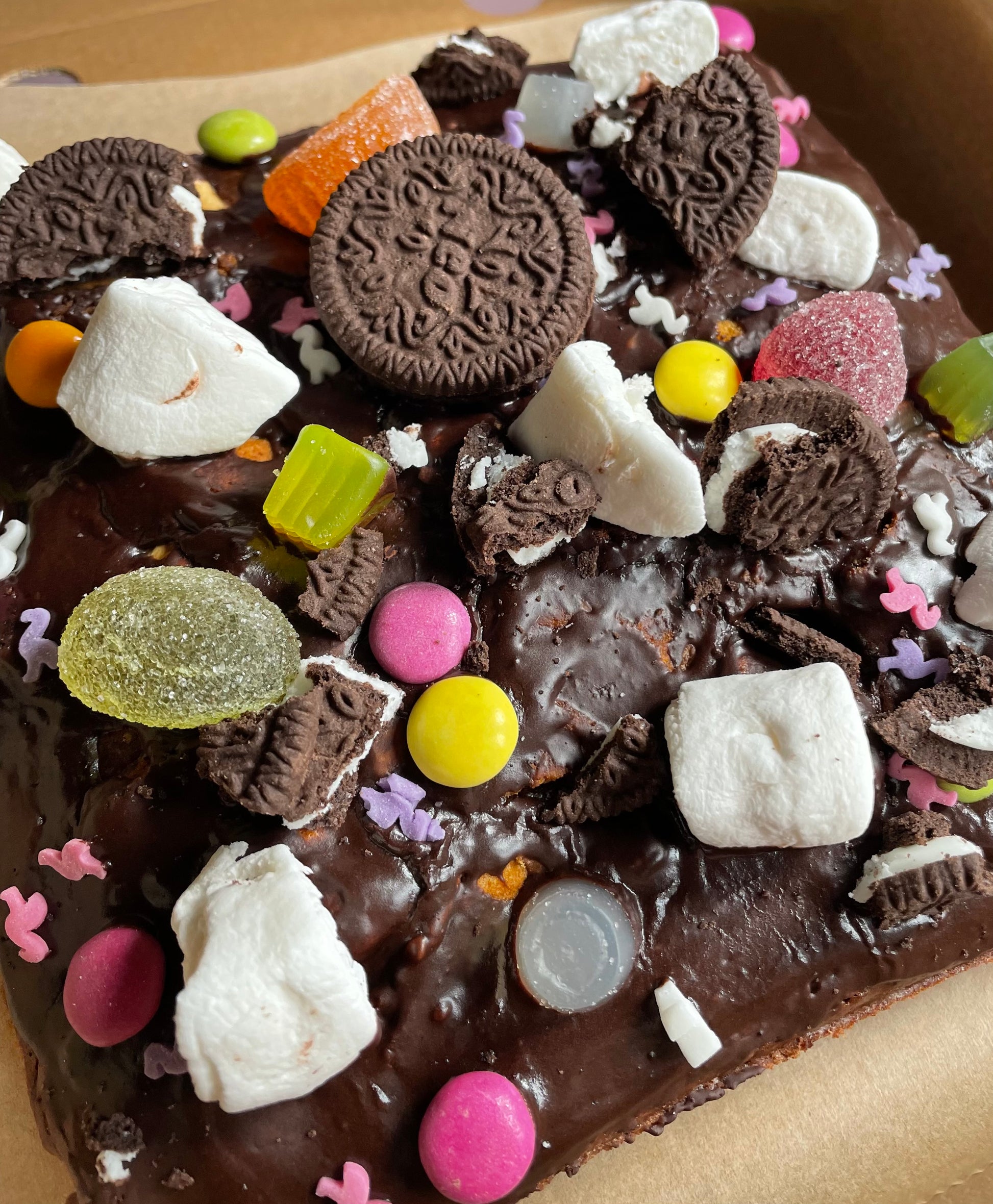This is my popular vegan chocolate brownie cake mixed with vegan chocolate, ginger biscuit, Biscoff, vegan marshmallows and vegan jelly sweets and biscuits. It’s topped with chocolate icing and a mix of vegan sweets. (Sweets may vary depending on availability)It’s approx 8 x 8 years inches, so plenty to share!