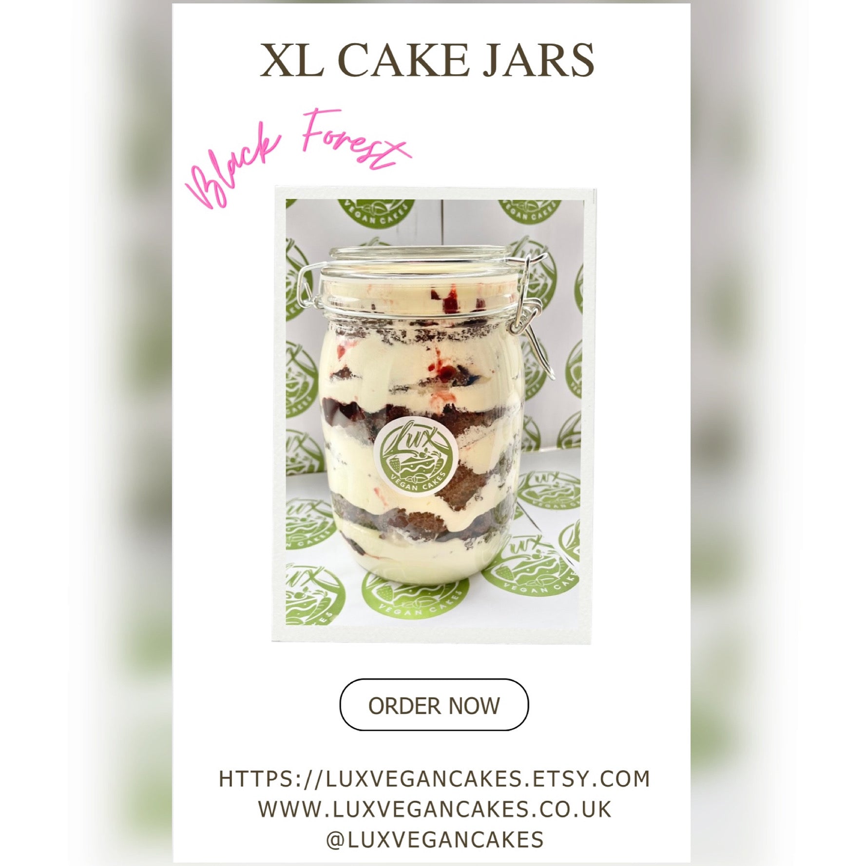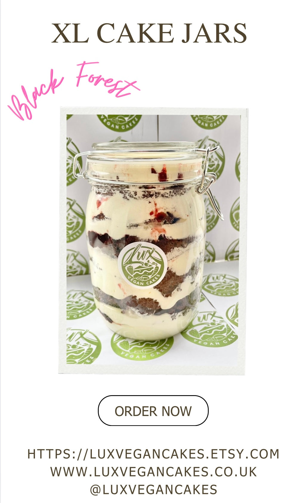 When a small jar isn’t enough for you try this WHOLE Vegan Black Forest Chocolate cherry Cake in a 1 litre glass jar. I layer vegan cherry flavoured chocolate sponge, cherry jam and vanilla buttercream layered together in a XL jar